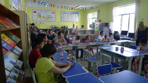 當日上午9時,12名6至14歲的學生,在家長的陪伴下來到了位于蘭州市七里河區南濱河路1119號的萬華實業集團1樓,免費實景體驗“中加學校特色課堂”。色彩斑斕的教室里,一位時尚親切的美女外教,在熱情的迎接著孩子和家長們的到蘭。先到的一些孩子們早已圍坐在課桌兩旁,他們和“洋老師”親熱地交談著,有的孩子睜大好奇的雙眼在觀察著教室里的玩具。