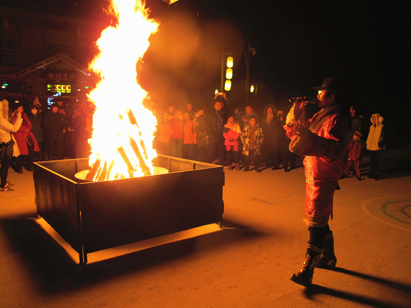 下午7時30分,客人們品嘗美食之后,迎新年篝火晚會在月牙泉小鎮中心廣場正式開始。紅紅的篝火燃燒起來了,歡快的音樂響起來了,由千年敦煌·月牙泉小鎮商戶才旦帶頭,客人們圍成一個圈,圍著篝火唱著、跳著、陶醉著……