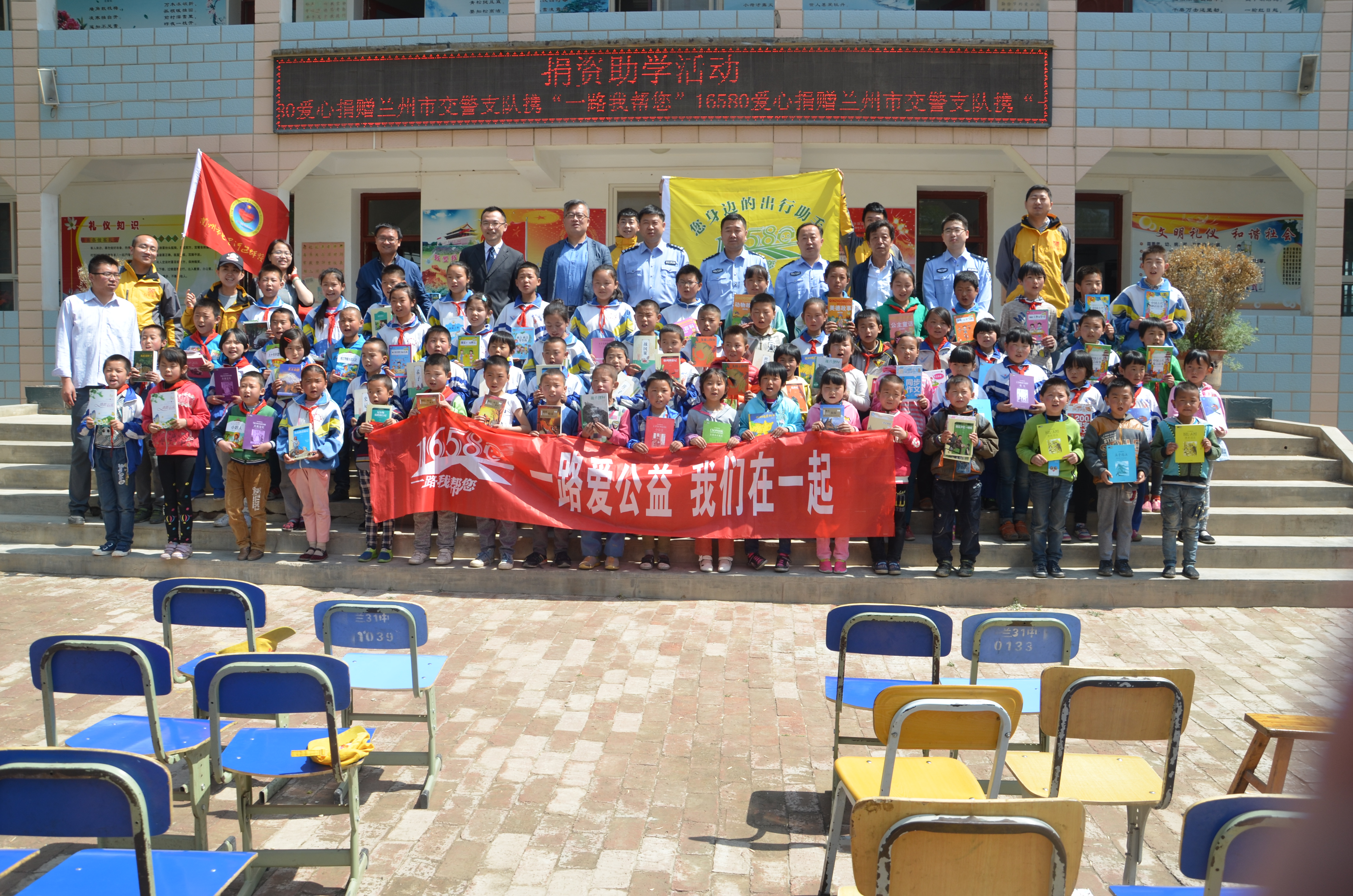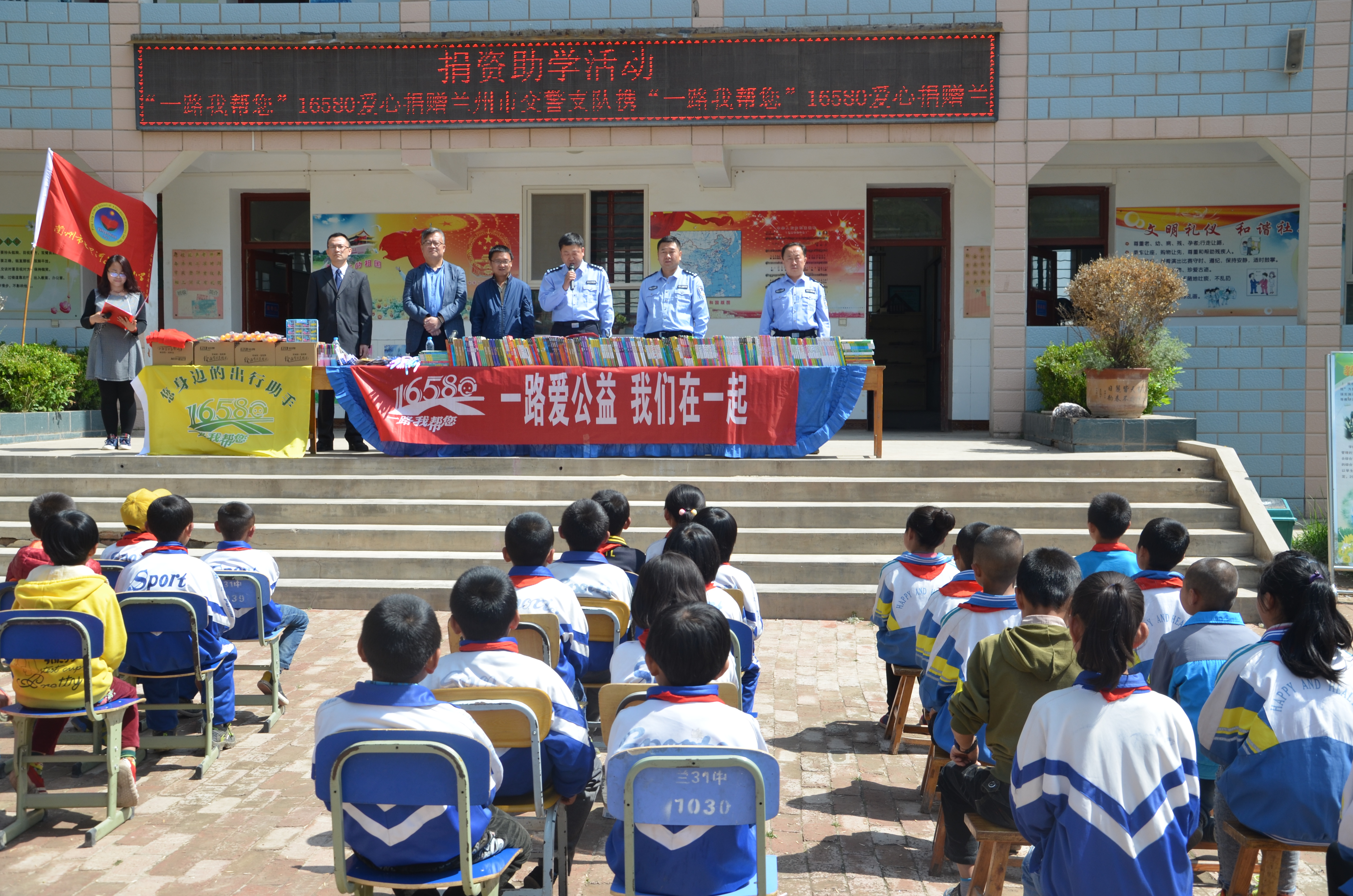 此次捐贈活動,蘭州市交警支隊政委張欣、副支隊長高建武、龔家灣大隊教導員楊吉發、交警支隊駐村民警曾樂晨、政工科王軍強 等一行十多人及萬華金慧總經理施強、副總經理張育民及一路我幫您16580工作人員一同參與。捐助儀式中,蘭州市交警支隊政委張欣對一路我幫您16580投入公益事業表示肯定,對一路我幫您16580為貧困山區兒童送去兒童節禮物表示感謝。