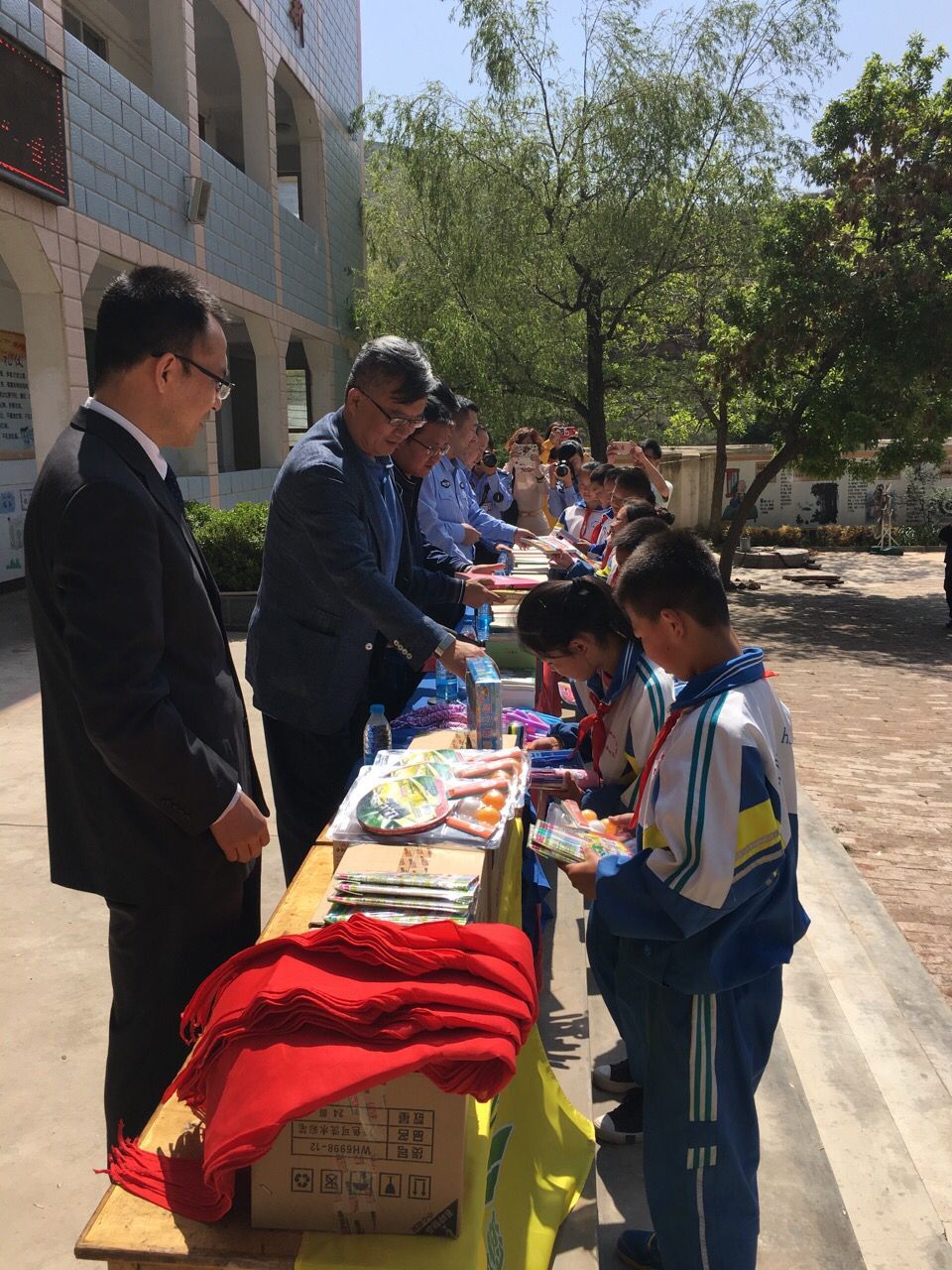 本次共捐贈圖書200本、鋼筆套裝5套、水彩筆96筒、鉛筆60支、橡皮36個、尺子15套、紅領巾50個、乒乓球拍5副、跳繩10個、魔方5個。