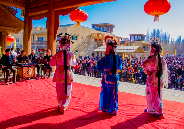 猜燈謎、看大戲,傳承中國佳節的傳統民俗。2月11日(正月十五),分別由敦煌市文化館、千年敦煌·月牙泉小鎮主辦的“敦煌非遺文化之戲劇表演”“傳統民俗之猜燈謎、打春牛、燒秦檜、蕩秋千”活動,在月牙泉小鎮歡樂拉開序幕。