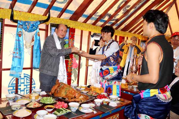 期間,調研組在月牙泉小鎮裕固族家園就餐,熱情好客的裕固族小伙為尊貴的客人獻上了潔白的哈達和濃香的酥油茶。嘉賓們品嘗了小鎮的各類特色美食,觀看了充滿民族特色的裕固族舞蹈,氣氛輕松活躍。