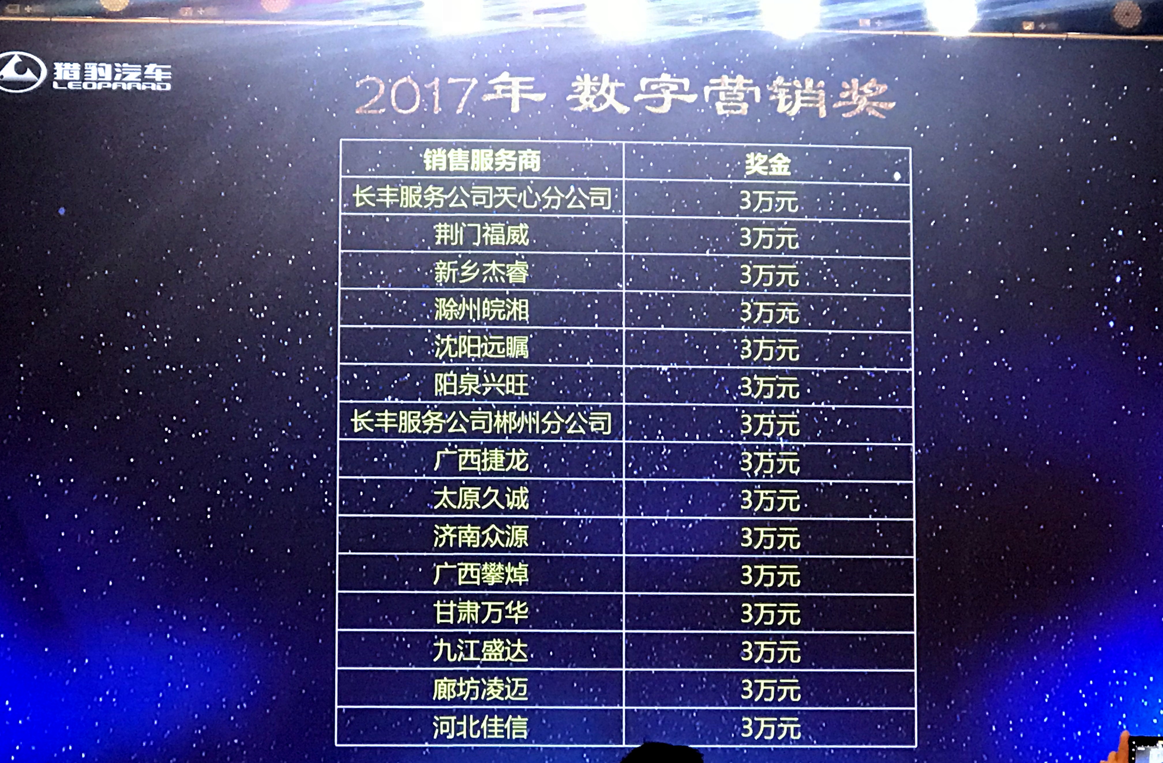 1月18日,湖南獵豹汽車(chē)股份有限公司“新時(shí)代,新跨越,共贏2018”獵豹汽車(chē)2018年?duì)I銷(xiāo)工作年會(huì)在長(zhǎng)沙世紀(jì)金源大飯店隆重舉行。甘肅萬(wàn)華實(shí)業(yè)集團(tuán)有限公司副總經(jīng)理宿曉中、甘肅萬(wàn)華金盛汽車(chē)銷(xiāo)售服務(wù)有限公司銷(xiāo)售經(jīng)理陳振中應(yīng)邀出席此次營(yíng)銷(xiāo)工作年會(huì)。會(huì)上,萬(wàn)華金盛憑借優(yōu)秀的營(yíng)銷(xiāo)能力榮獲“2017年度數(shù)字營(yíng)銷(xiāo)優(yōu)秀獎(jiǎng)”。