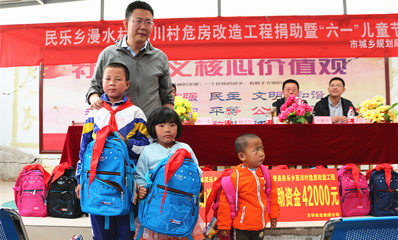 6月1日上午11時20分,民樂鄉(xiāng)漫水村、西川村危房改造工程捐助暨六一兒童節(jié)活動在永登縣民樂鄉(xiāng)漫水村村委會如期舉行。甘肅萬華實業(yè)集團有限公司向漫水村、西川村各捐助4.2萬元危房改造補助資金,蘭州市城鄉(xiāng)規(guī)劃局領(lǐng)導(dǎo)將嶄新的書包和學(xué)生用品送到當?shù)睾⒆觽兪种小Lm州市城鄉(xiāng)規(guī)劃局局長陳一夫、黨組書記楊正岱,蘭州市城鄉(xiāng)規(guī)劃局黨組成員、副局長盧健、楊正華、劉鵬堂,甘肅萬華實業(yè)集團有限公司董事長牛新民、副總經(jīng)理宿曉中,民樂鄉(xiāng)漫水村黨支部書記張成海,民樂鄉(xiāng)西川村黨支部書記楊天海等領(lǐng)導(dǎo)出席活動。