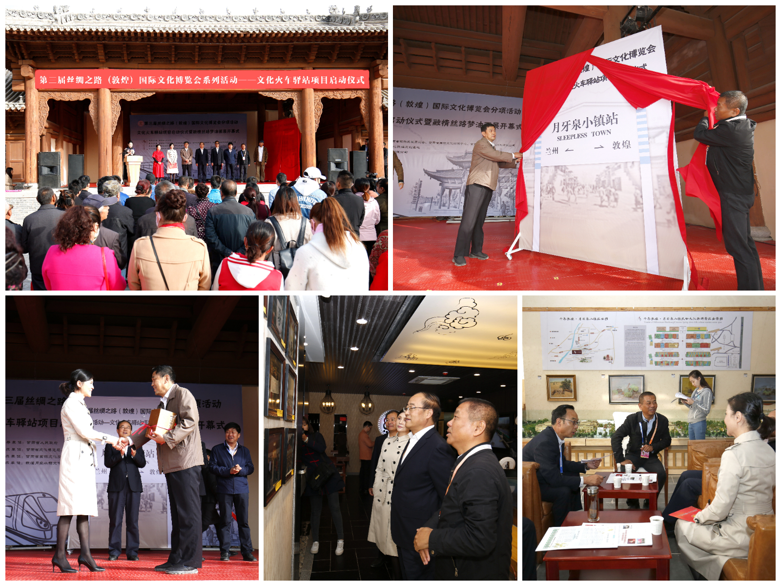 9月26日上午,第三屆敦煌文博會分項活動之一的“絲綢之路文化火車驛站項目”在千年敦煌·月牙泉小鎮中心廣場舉行啟動儀式。甘肅省政協文史委員會主任、甘肅省國際文化交流中心(協會)副理事長張正鋒, 甘肅省旅游發展委員會副主任楊宇宏,甘肅省國際文化交流中心(協會)秘書長王曉琴,敦煌市旅游局局長陳錦業等領導出席啟動儀式。甘肅蘭鐵國際旅行社有限公司副總經理白林,甘肅萬華實業集團有限公司總經理、敦煌月泉小鎮文化旅游有限公司董事長牛新偉共同為文化火車驛站啟動揭幕。