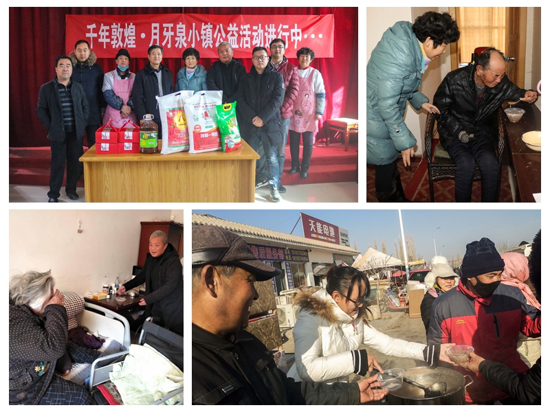 在陽關老年公寓,千年敦煌·月牙泉小鎮項目總監熊秀霞和客房運營管理中心運營總監郭龍帶著盛好的粥來到行動不便的老人身邊,熱情地說道:“今天是臘八節,月牙泉小鎮來給你們送臘八粥了!過完臘八就是年,提前祝你們新年快樂!”老人們聽到后,眼含淚光,有的擦拭著眼角,喃喃地說:“是熱的,謝謝,謝謝……”
