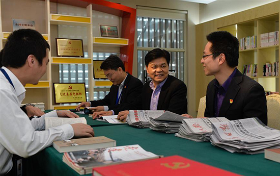 在亨通集團黨員服務中心閱覽室,崔根良(右二)和黨員們一起學習交流。 新華社記者 季春鵬攝