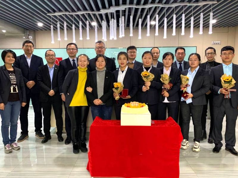 青海金易達總經理丁云艷為司齡新晉5年和10年老員工佩戴金銀徽章,與全體員工共同送出對萬華21歲生日的祝福