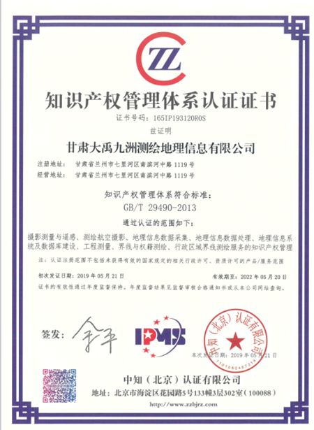 5月21日,甘肅大禹九洲測繪地理信息有限公司順利通過《企業知識產權管理規范》國家標準審核認證,并獲得該管理體系認證證書。