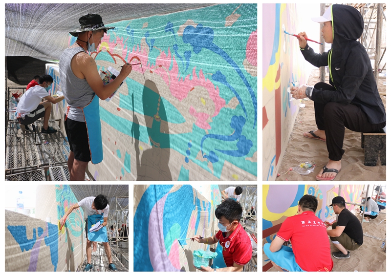 隨著絢麗多彩的巨型壁畫逐漸完工,一幅被腳手架和遮陽布遮擋的藝術作品隱約躍入眼簾。大家不禁為西美研學團堅持不懈完成畫作的精神點贊,期待壁畫完工之時,看到他們講述的千年敦煌之美。