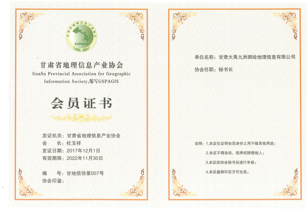 甘肅省地理信息產業協會會員證書