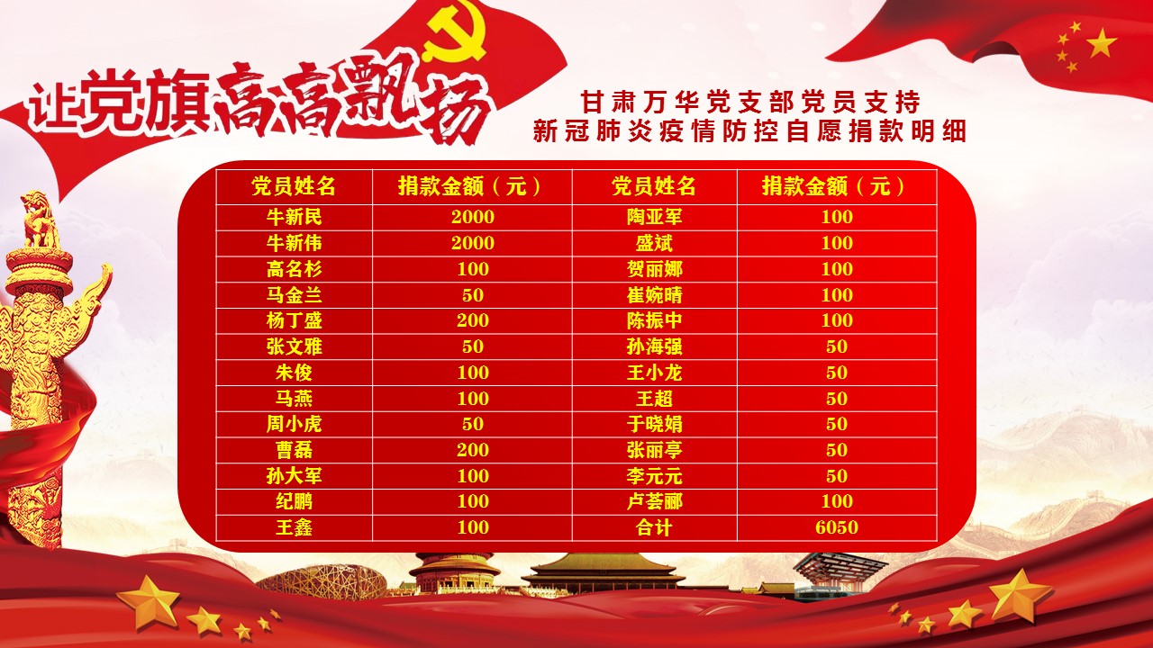 截止到當日17時,共有25名萬華集團黨支部黨員、預備黨員、入黨積極分子自發地進行了捐款,捐款總額6050元。這筆捐款通過蘭州市總商會黨委統一捐至防疫工作最需要的第一線,主要用于慰問戰斗在疫情防控斗爭第一線的醫務人員、基層干部群眾、公安民警和社區工作者等,資助因患新冠肺炎而遇到生活困難的群眾和因患新冠肺炎去世的群眾家屬,慰問在疫情防控斗爭中犧牲的干部群眾家屬等。